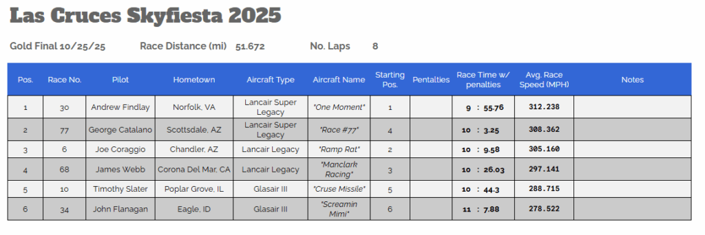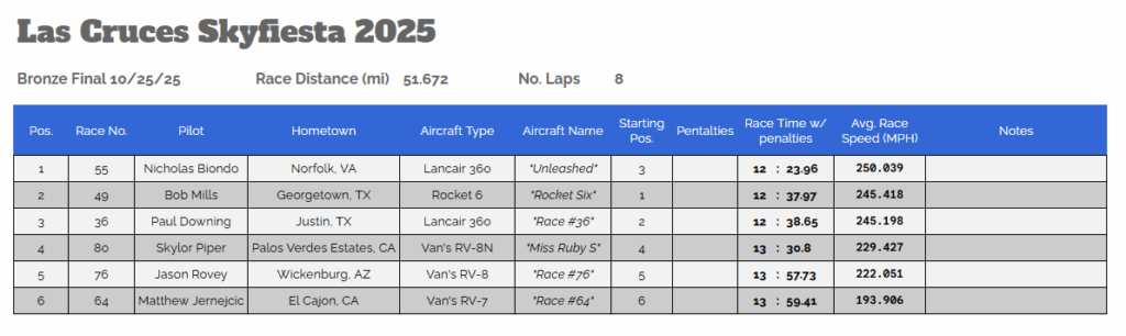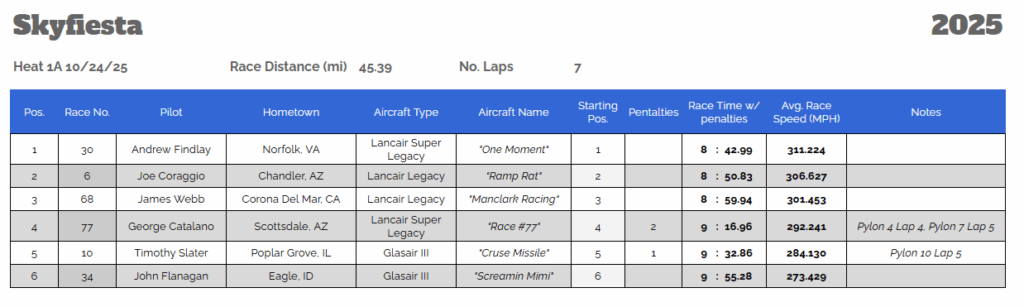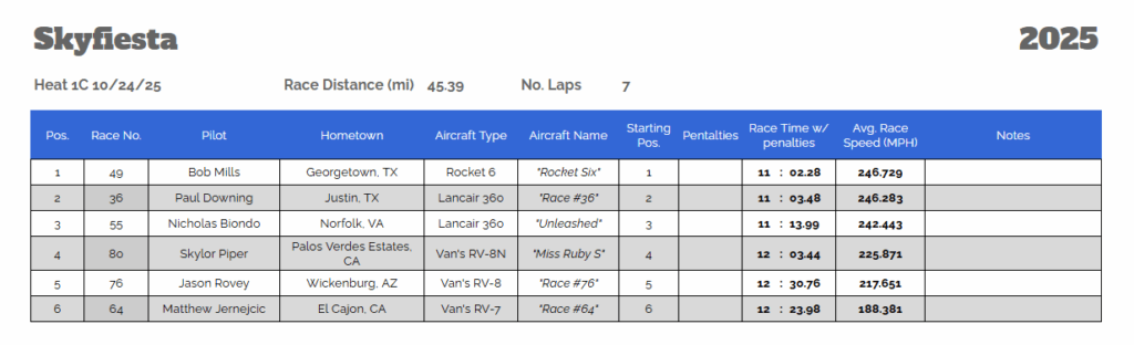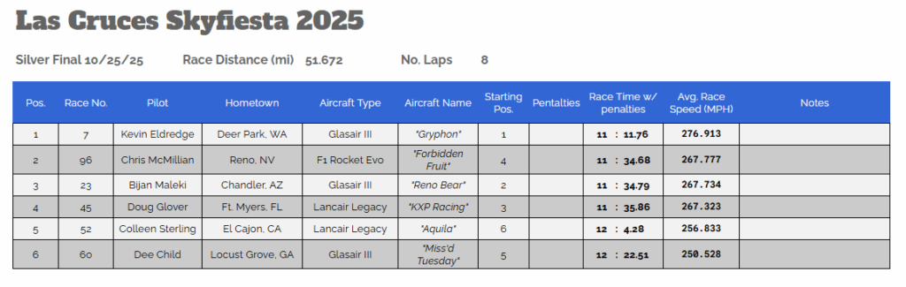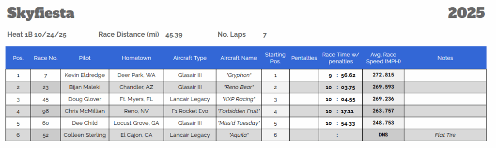 | Pilot Name | Aircraft Type | Race Number | Best Speed |